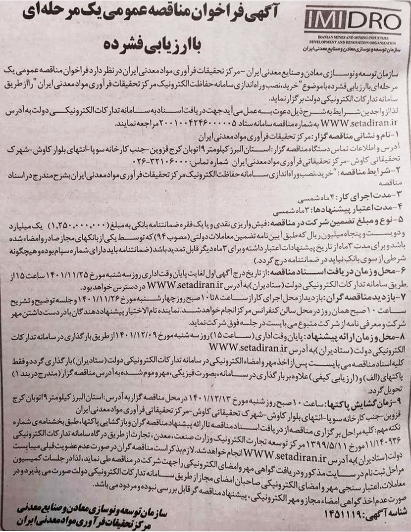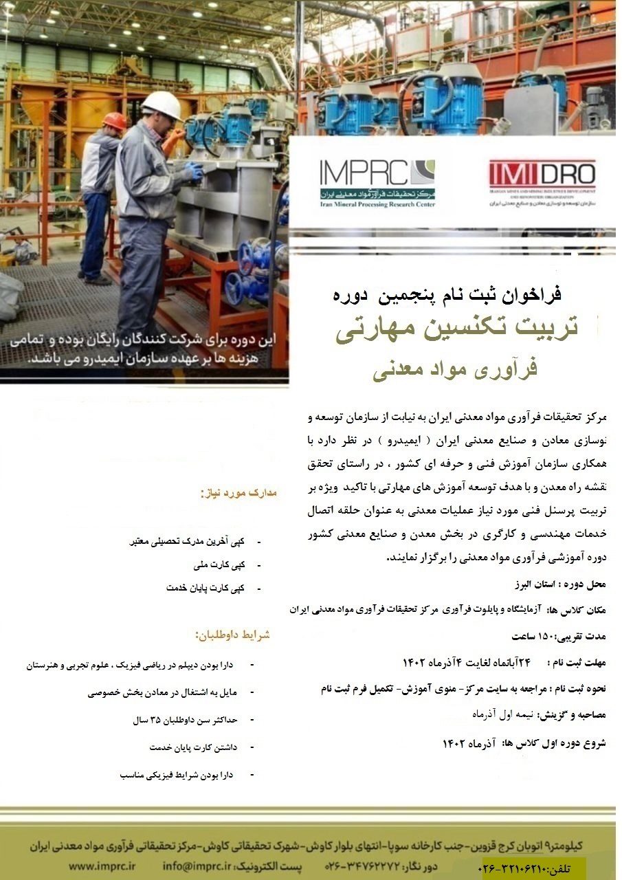 Iran's mineral processing research center is located in Kavosh research town, 60 kilometers west of Tehran, on the Karaj-Qazvin freeway. The most important goals of this center are to conduct mineralogical and chemical studies on exploratory, mineral and ore-arrangement samples, as well as mineral processing research in both laboratory and semi-industrial scales and optimization of processing processes. The laboratories of the center have the ISO/IES17025 standard certificate, and in addition to that, the chemical and environmental, occupational safety and health laboratory has the certified certificate of the Environmental Protection Organization. This center is registered as a processing research center of ECO member countries and is the only laboratory of the industry and mining sector that is a member of the nanotechnology laboratory network.